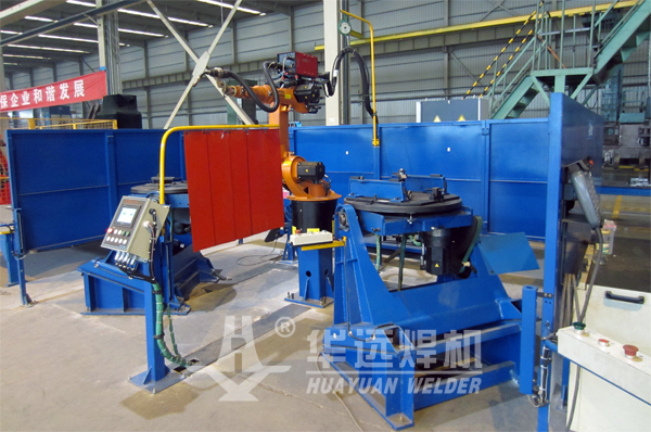 壹套焊接機器人+兩套雙軸焊接變位機組合方式,雙外部軸與機器人聯動。