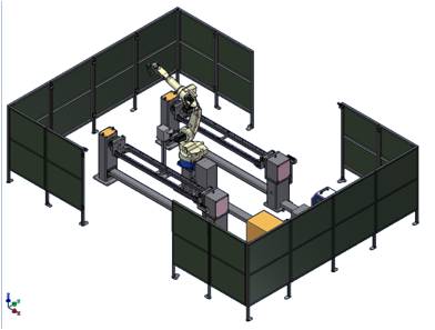 該機(jī)器人焊接工作站主要用于煤機(jī)結(jié)構(gòu)件的自動焊接,采用頭尾架式單軸變位機(jī)+六軸聯(lián)動機(jī)器人雙工位布局,機(jī)器人安裝于雙工位中間。為方便進(jìn)行多種規(guī)格工件焊接及參數(shù)設(shè)置,控制系統(tǒng)采用三菱PLC+工業(yè)觸摸屏方式進(jìn)行控制和操作,使整套設(shè)備具有更大的柔性及靈活性,并可有效提高生產(chǎn)效率。